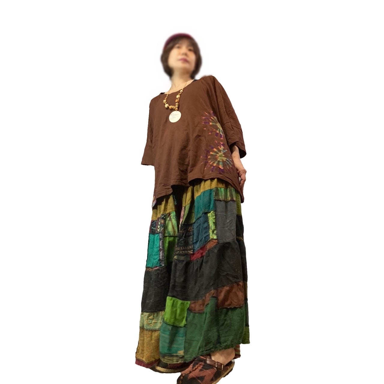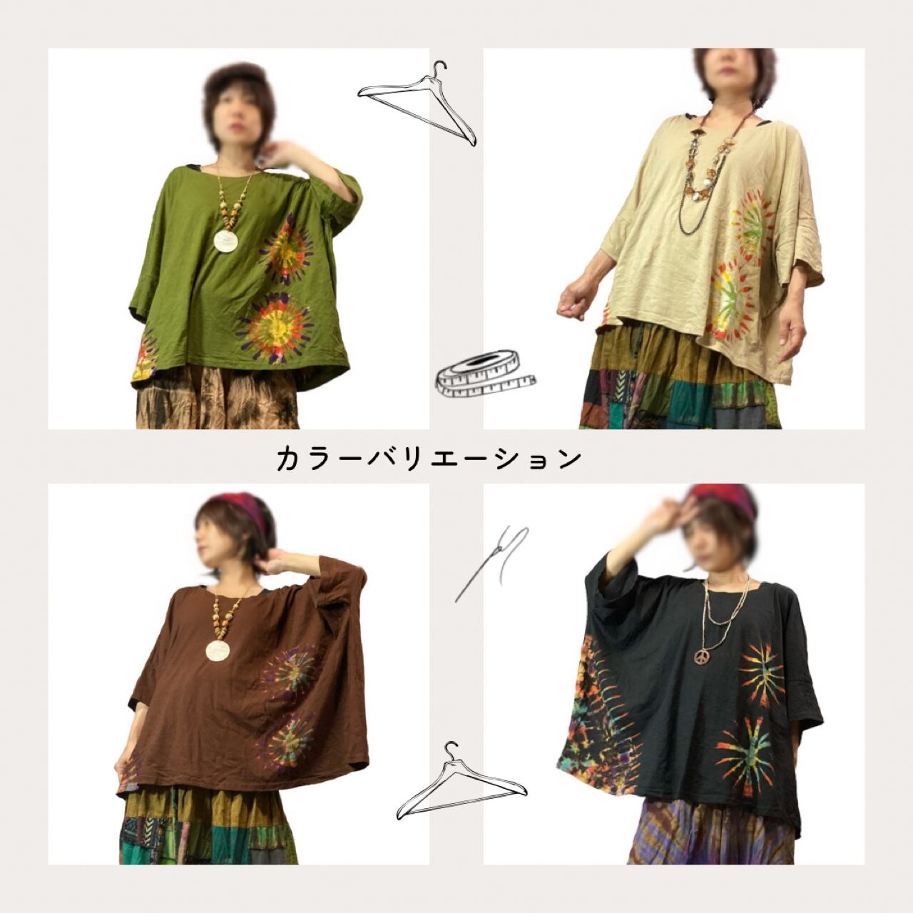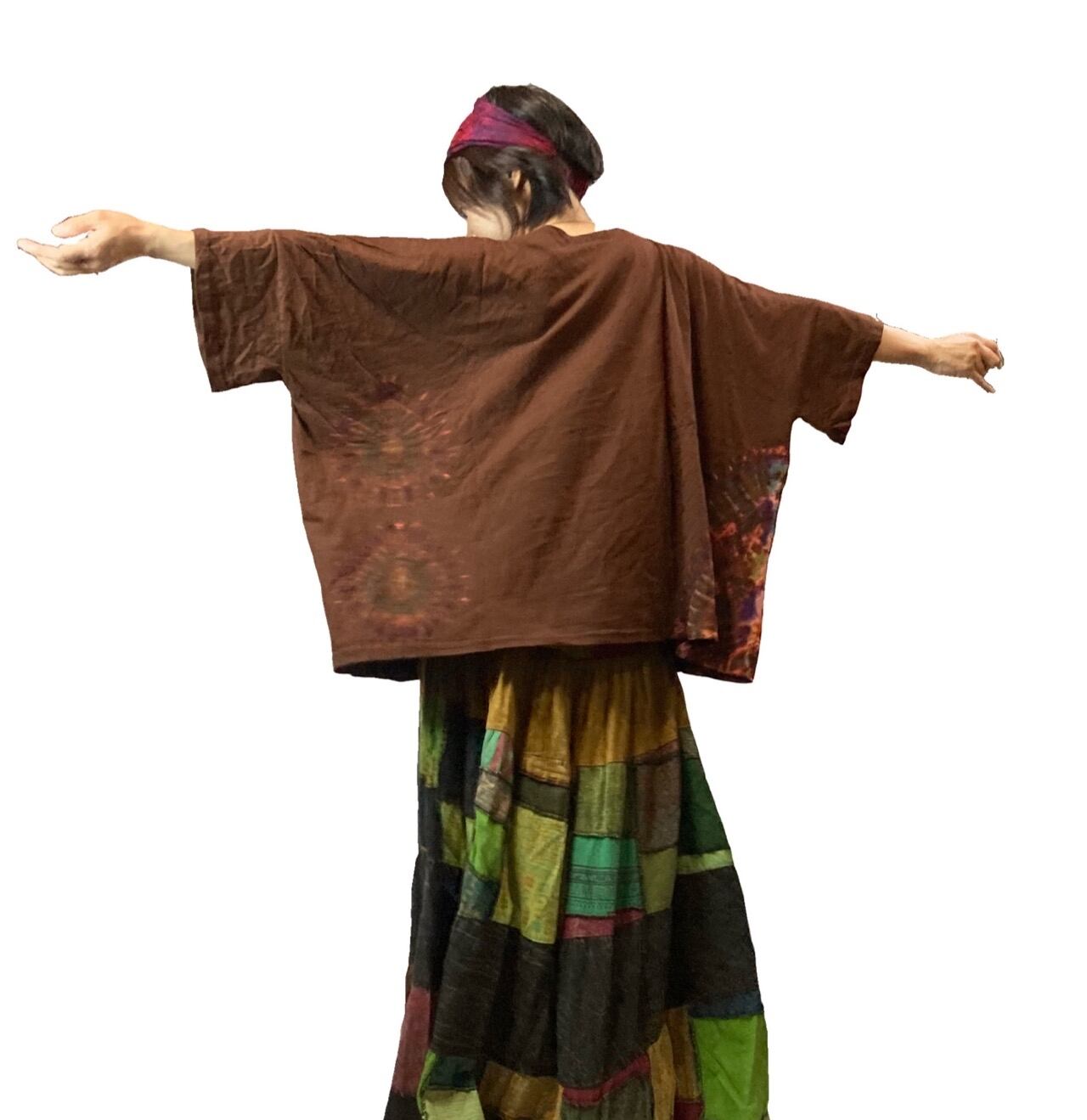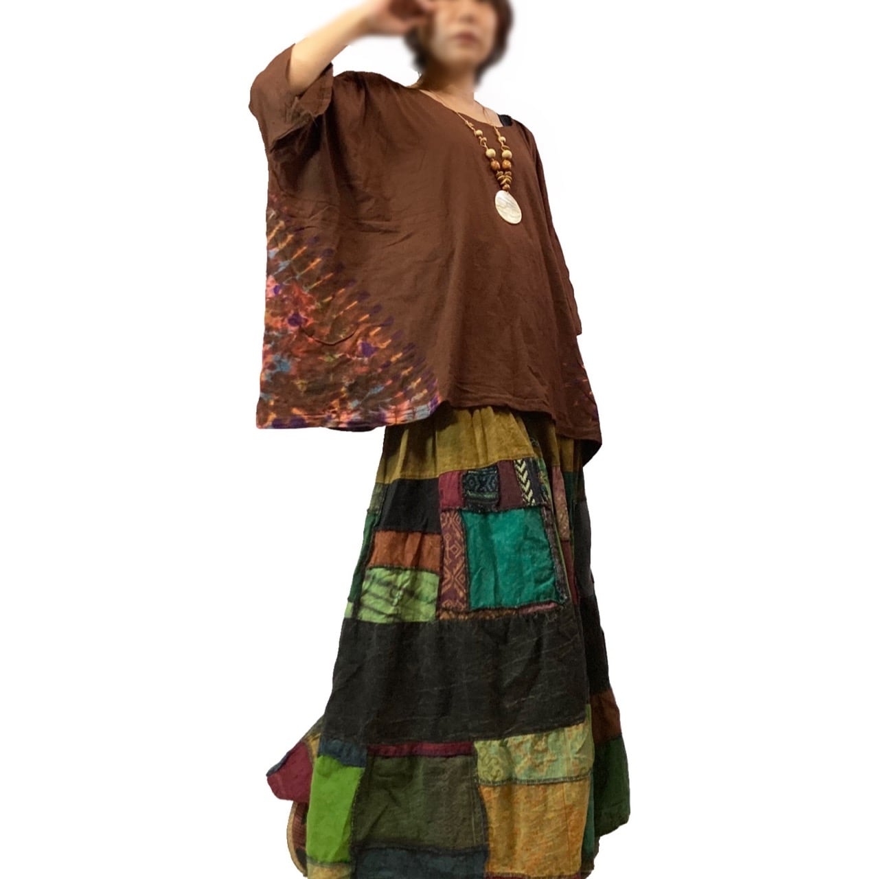 【ブラウン】タイダイ染コットンゆるT-エスニックプルオーバーシャツ|男女兼用オーバーサイズトップス_ゆったりサイズ